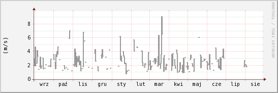 Poniższe wykresy obrazują wyniki pomiarów stacji do dnia 2004-08-31. Z boku znajdują są: wartość średnia, maksymalna oraz minimalna. Każdy wykres jest odnośnikiem do strony przedstawiającej pomiary danego parametru meteorolgicznego z ubiegłego dnia, tygodnia, miesiąca i roku (od daty dzisiejszej).