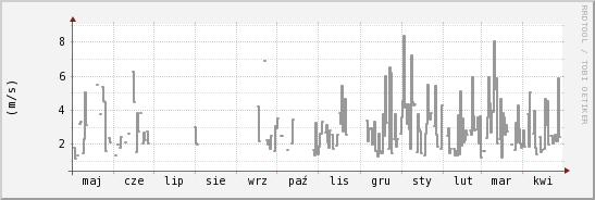 Poniższe wykresy obrazują wyniki pomiarów stacji do dnia 2005-05-02. Z boku znajdują są: wartość średnia, maksymalna oraz minimalna. Każdy wykres jest odnośnikiem do strony przedstawiającej pomiary danego parametru meteorolgicznego z ubiegłego dnia, tygodnia, miesiąca i roku (od daty dzisiejszej).
